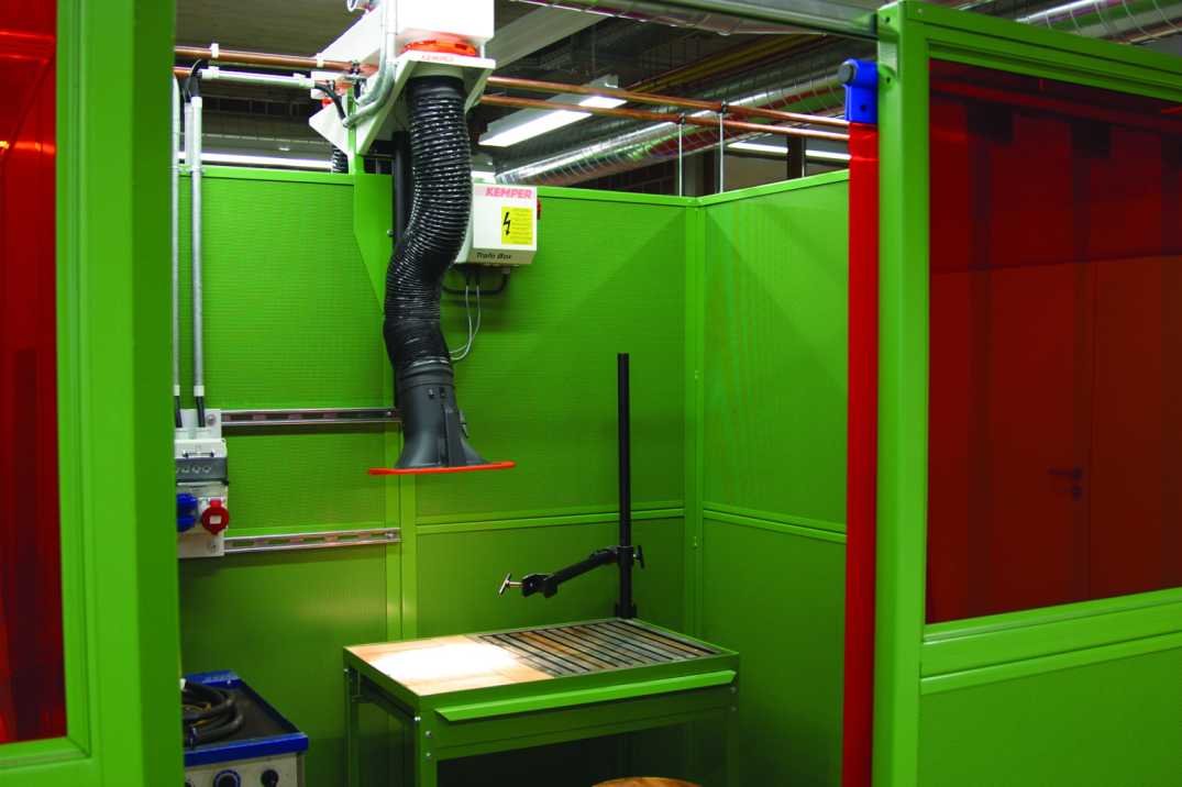 Vzájemným sešroubováním těchto komponentů a ukotvením sloupu k podlaze obdržíte stabilní konstrukci, na kterou je možné zavěsit odsávací, popř. teleskopická ramena. Na čelních stranách takto vzniklých kabin a boxů lze pomocí úchytek instalovat konstrukce pro zavěšení ochranných lamel a zástěn.